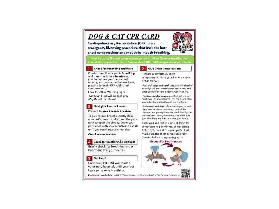 🐾 Preparedness & Documentation – Pet CPR card, fire rescue stickers, document holder, medicine bottles, feeding instructions, and rescue whistle.